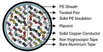A layer of bare aluminium tape (0.2mm/8mil) is applied longitudinally with overlap over the cable core to provide 100% electrical shielding coverage and ensures a barrier against water vapor. In cables with more than 200 pairs, the aluminum tape may be corrugated for improved cable flexibility