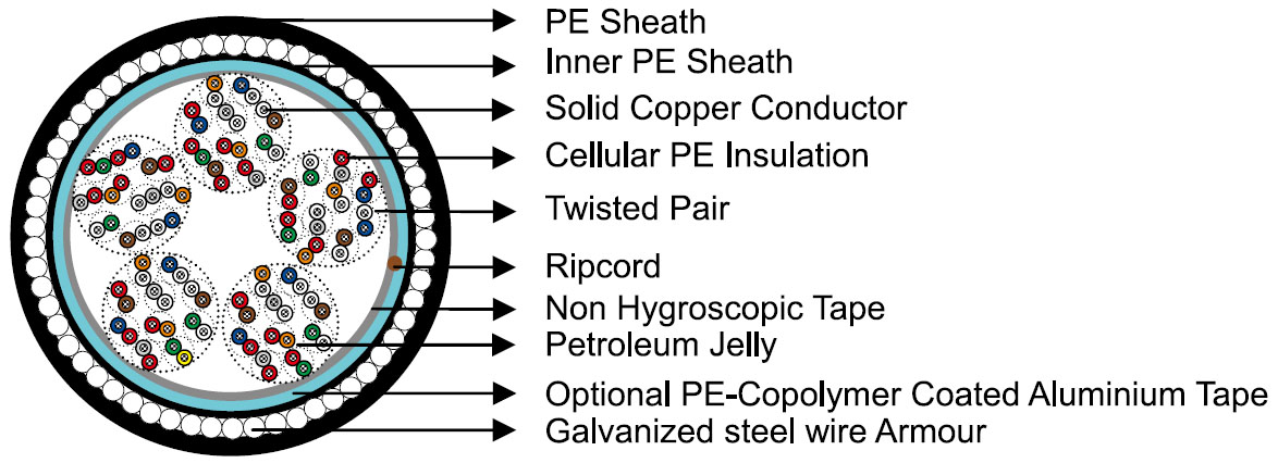 The cables are designed for use in access or trunk networks, from telephone exchange to subscriber area. The cables are suitable for installation in ducts, direct burial in the ground and also for aerial installation with integral suspension strand. Jelly filled construction is for subscriber’s cables installed underground or along the edge of pavement. An armoured option is offered for direct burial installations. A figure-8 self support option is offered for aerial installation.