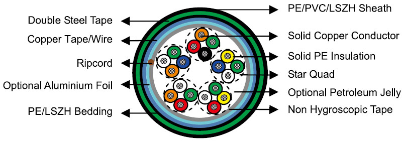 The cores are cabled together in concentric layers to form the cable core. Units are identified by colour coded binders